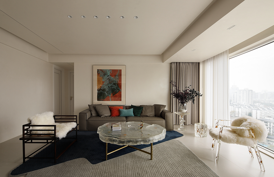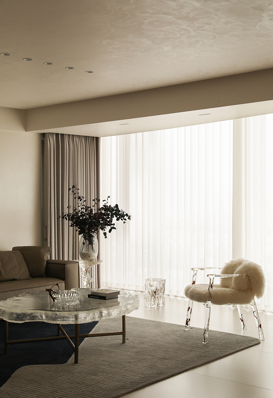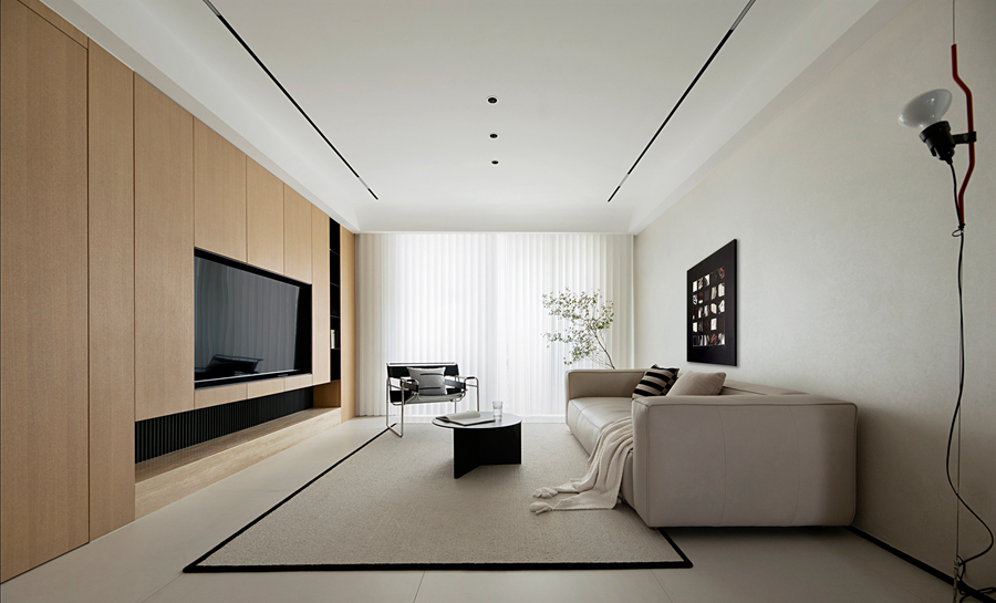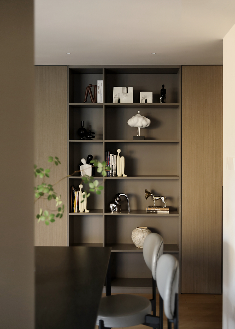 我并未挪用假山窗花,而是以现代干净的体块构筑空间,摹写园林的“间”与序列。通过大面积留白,践行中国画“计白当黑”的哲学,为生活留出呼吸与想象;一道连续的木质格栅,在空间中切割出光与影的韵律,模仿游园时“移步换景”的体验,悄然引入时间性。家具摒弃厚重形制,选用线条清瘦、功能现代的款式,于轻盈中承载日常。