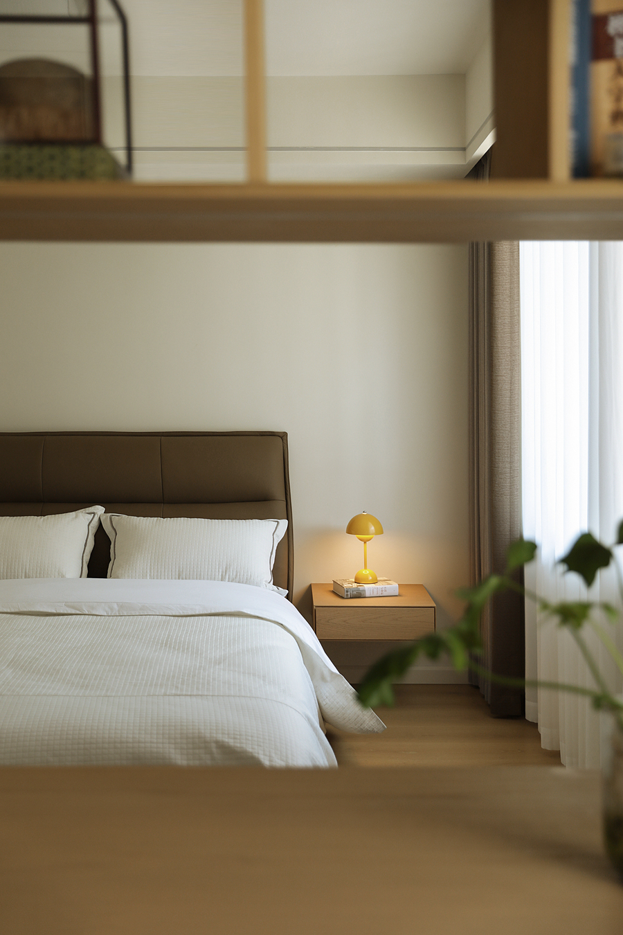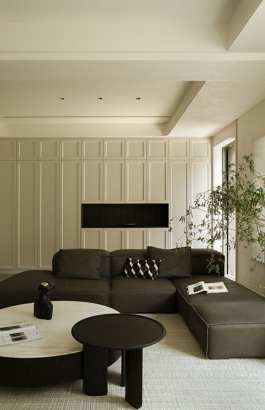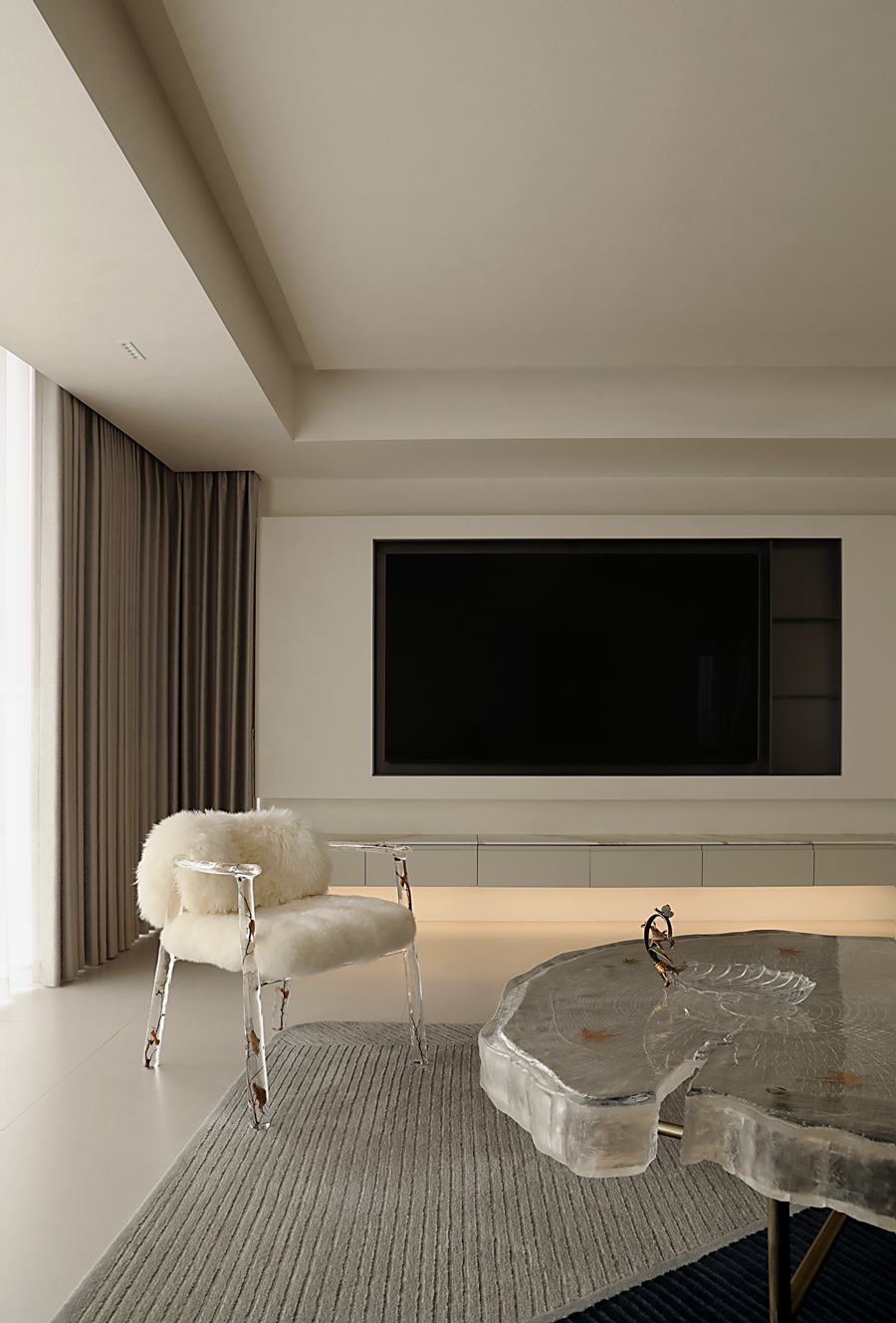 我并未挪用假山窗花,而是以现代干净的体块构筑空间,摹写园林的“间”与序列。通过大面积留白,践行中国画“计白当黑”的哲学,为生活留出呼吸与想象;一道连续的木质格栅,在空间中切割出光与影的韵律,模仿游园时“移步换景”的体验,悄然引入时间性。家具摒弃厚重形制,选用线条清瘦、功能现代的款式,于轻盈中承载日常。